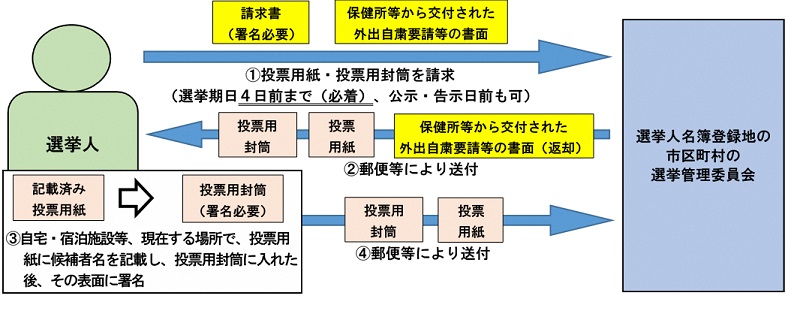 選挙期日4日前までに、感染症法又は検疫法による外出自粛要請又は、検疫法による隔離・停留の措置にかかる書面(以下外出自粛要請等の書面)を添えて、村選挙管理委員会へ投票用紙等の請求をしてください。