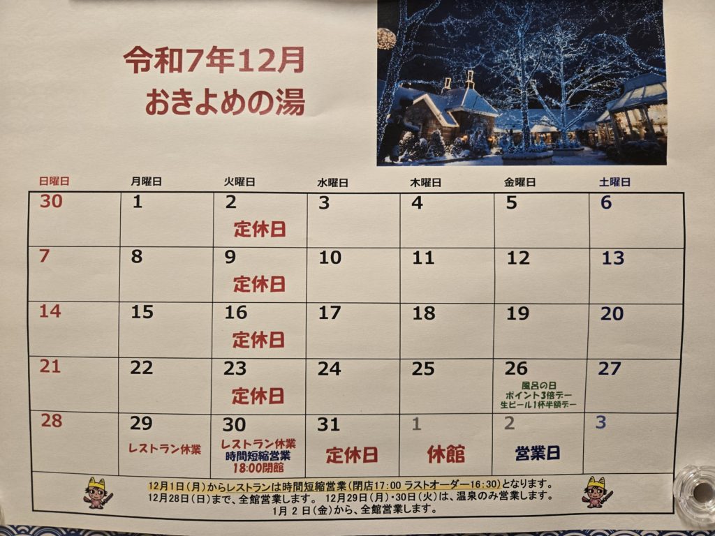 4月のおきよめの湯の定休日は2日、9日、16日、23日です。