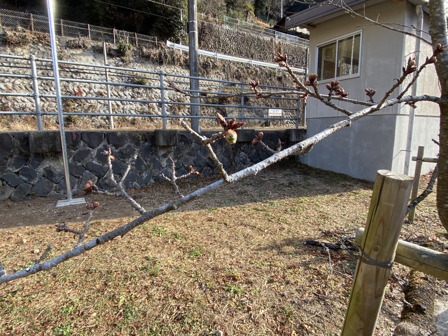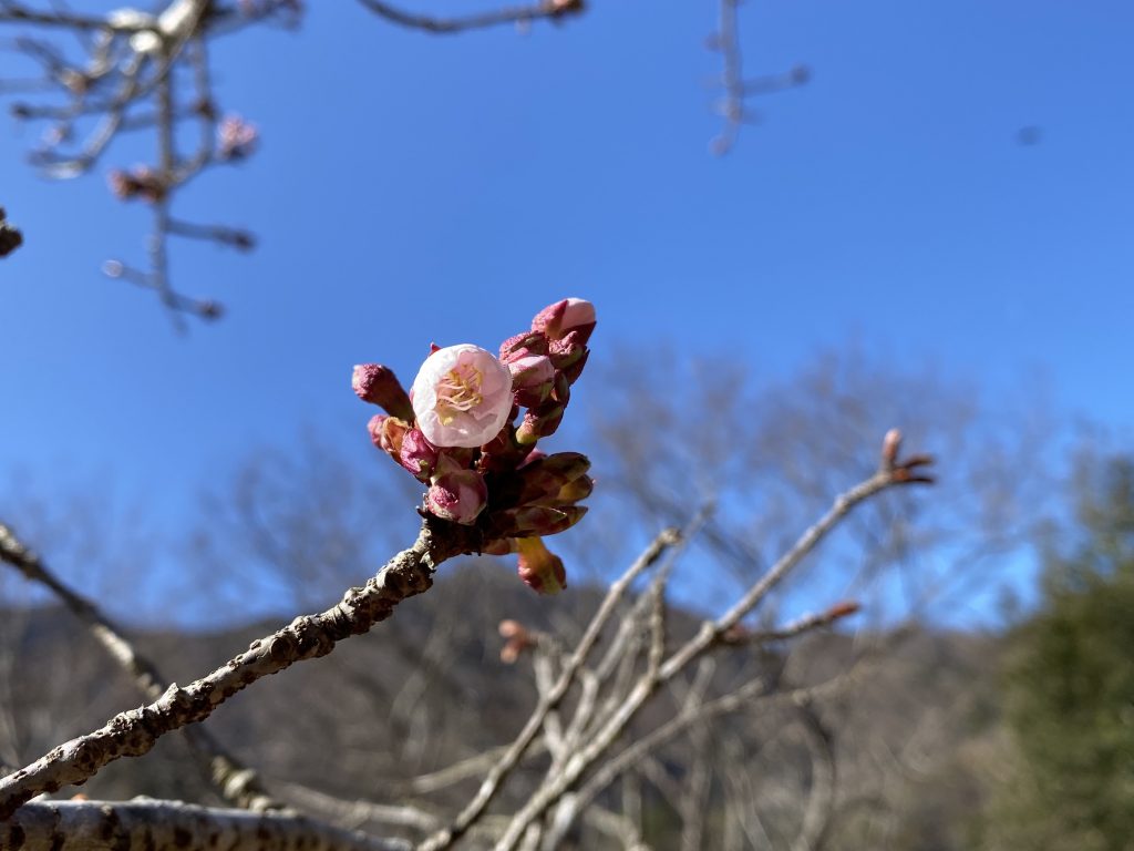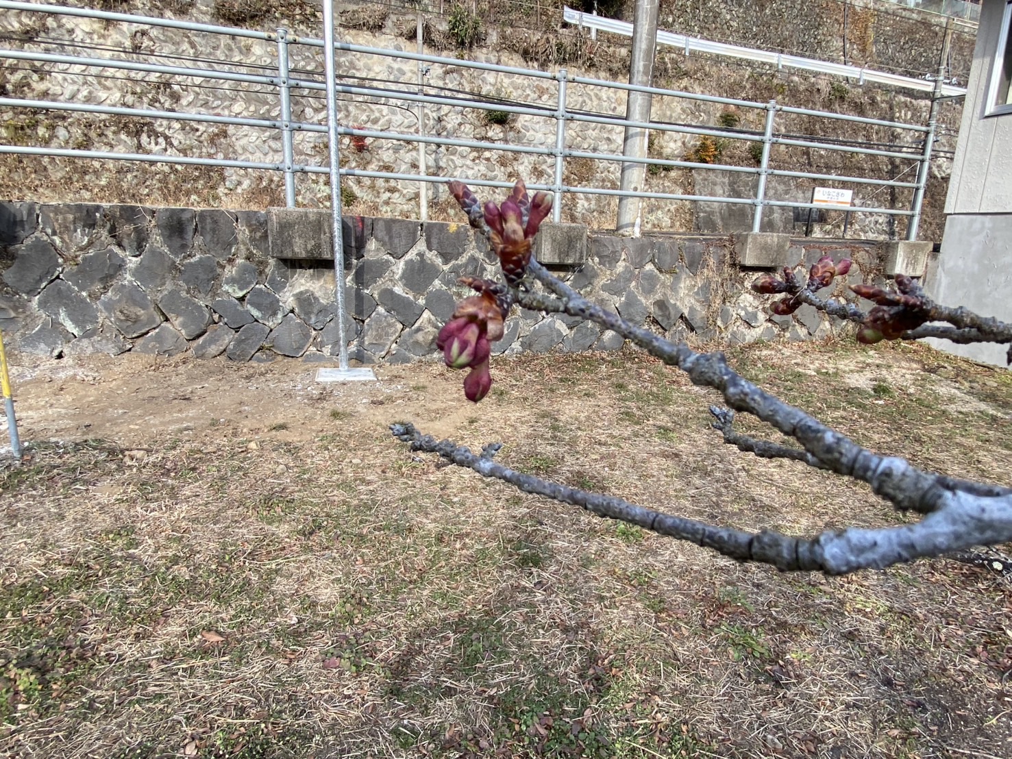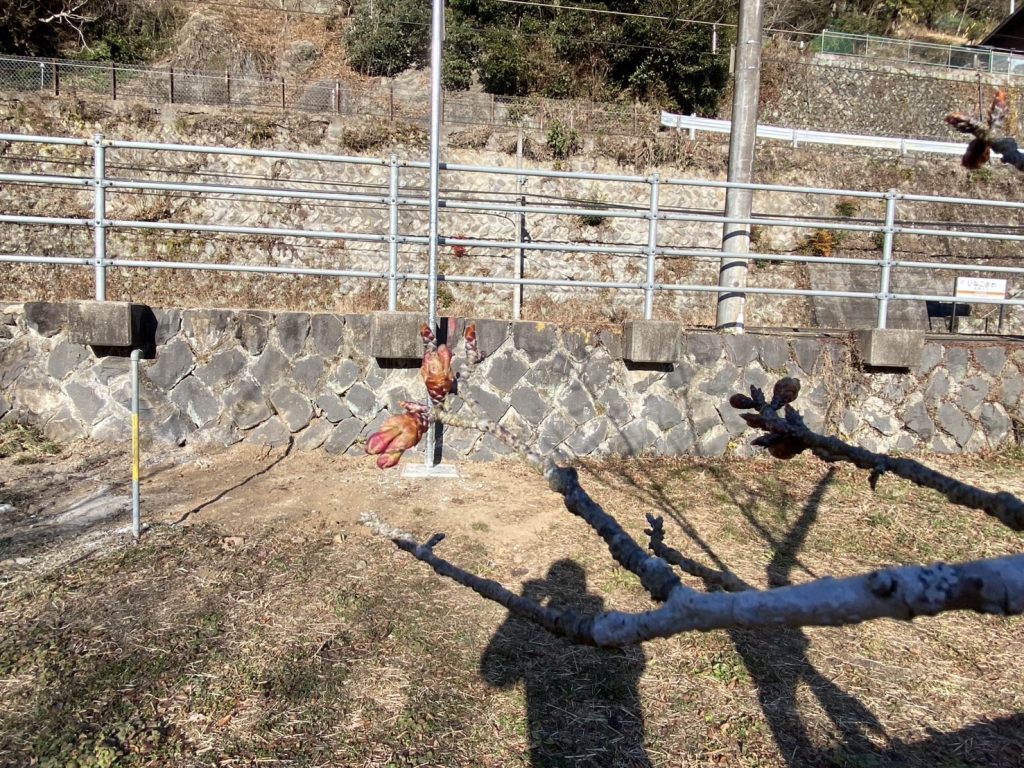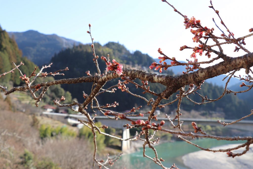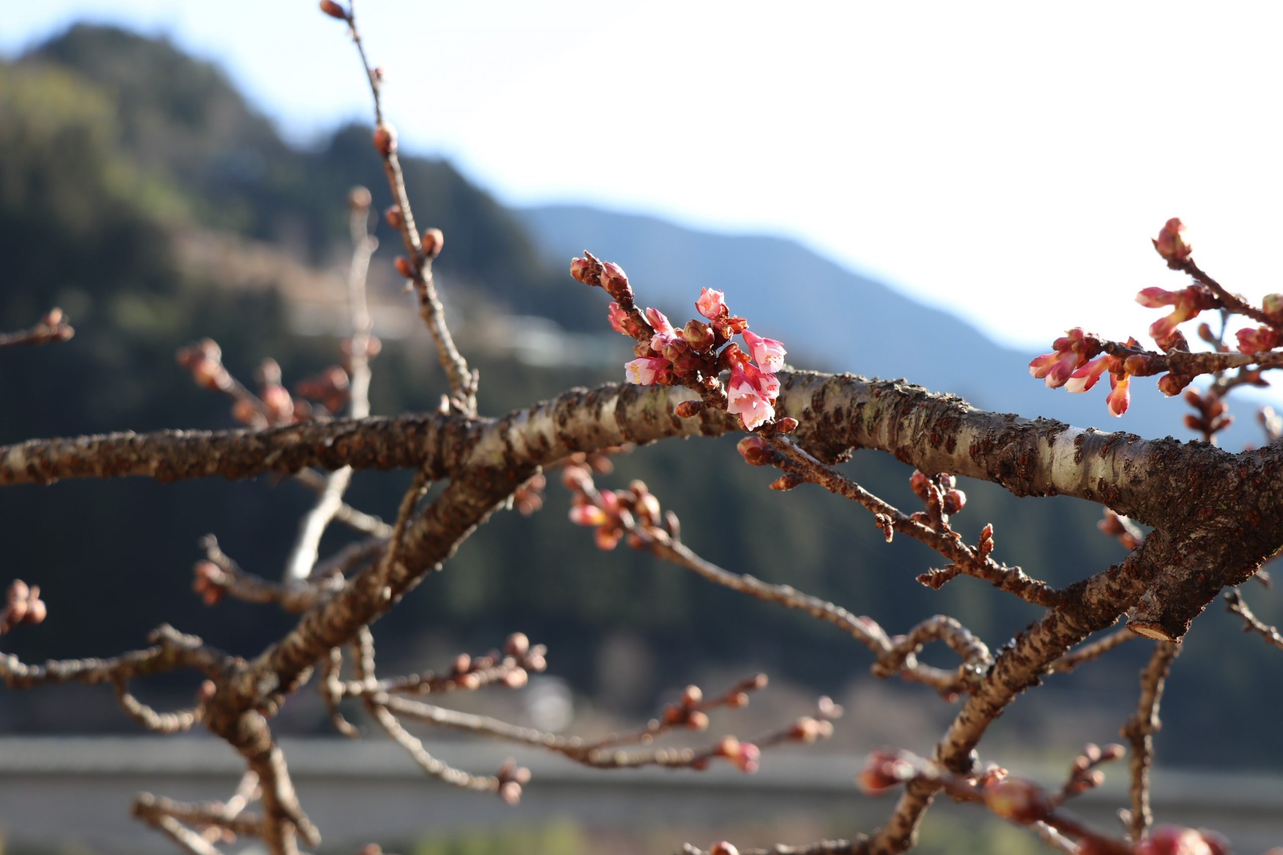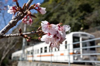 JR伊那小沢駅の構内にある約5本の「カンザクラ」は、信州でもいち早くピンク色の花を咲かせ、春の便りを告げてくれます。
