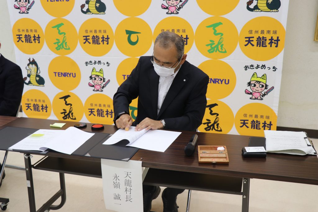 令和4年8月4日(木)に佐川急便株式会社と天龍村との間で「災害時における支援物資の受入及び配送等に関する協定書」の調印式が行われました。