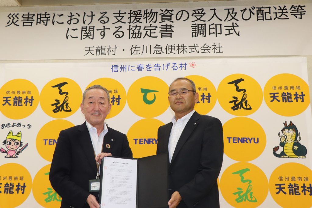 この協定は、災害発生時に天龍村に対していただく各支援物資等の受入や管理、必要な避難所への配送業務について、佐川急便株式会社様が天龍村に代わって担っていただけるという内容のものです。