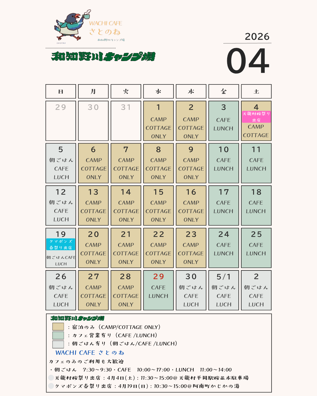 和知野川キャンプ場・WACHI CAFE さとのねの4月営業予定をご案内します。