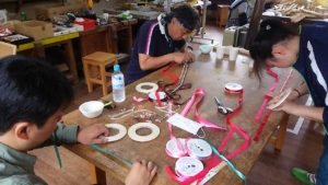 7月13日(土)に第16回ハンガー製作会を実施しました。 今回は7月~8月に贈呈する予定の約400本のハンガーを分担して準備。 仕上げ、修正、仕分け、リボンづくり等、様々な分担で作業をしました。 天龍村に留学している4名の大学生も参加し、インターナショナルな製作会になりました。