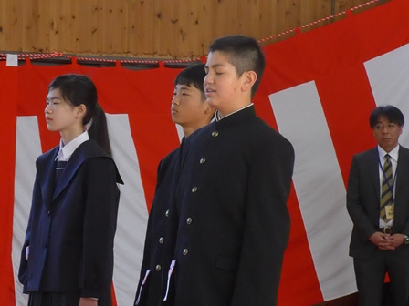 小学校の時とは違った緊張感で入学式に臨みました。先輩方のきびきびとした起立や礼を一人一人が意識する姿を見て、自分も先輩を見習って生活していきたいと思います。(1年生)