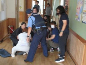 7月4日(木)に防犯訓練を行いました。今年度から小中併設になったので小中合同で行いました。併設になったことで職員数が増え、昨年に比べると職員の分担が手厚くなり、対応の人数が増えました。不審者が侵入したことを想定した訓練を行いました。訓練後、警察署の方にさすまた等の使い方についても指導をしていただきました。