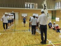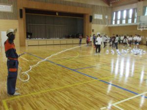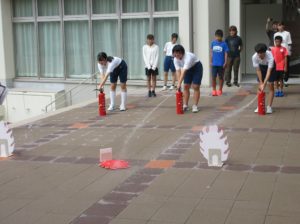 9月2日(月)に防災訓練を行いました。今回は、巨大地震が発生する恐れがある事を想定した訓練を行いました。体育館に整然と避難ができました。その後、村消防団の方に、体育館内の消防設備の説明、消火器の使い方について説明していただきました。最後に、水消火器を使って消火訓練を中学生と小学校6年生が体験をしました。いつ発生するか分からない災害に対するこのような訓練を今後も大切にし、実際を想定した訓練へと繋げていきたいと思います。
