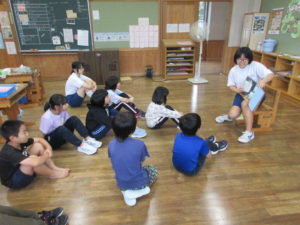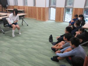 10月25日(金)に読書旬間中の企画として、中学生有志による小学生への読み聞かせが行われました。担当する学年に併せた本を選び、時々小学生に目線を向けゆっくりと丁寧に読んでいるのが印象的でした。こんな企画がさっとできるのも小中併設校になった良さですね。