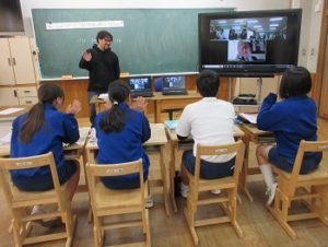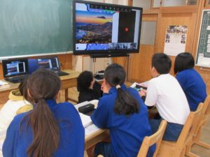 ALTのハンガリーの友人とオンラインで繋がって1年生が英語の授業を行いました。生徒達は、天龍村のことを紹介しました。また、ハンガリーのことを紹介していただき、生徒達は、分からないこと、もっと知りたいことを質 問しました。天龍村や日本との違いに驚いていました。視野を広げるよい機会となりました。
