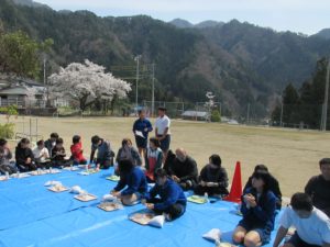4月8日(火)に小中合同で青空給食を行いました。いつも食べているランチルームの外に出て、シートの上でピクニック気分でおいしく給食を食べました。丁度校庭の桜が満開で花を添えてくれました。給食を食べながら中学生が新しく来られた先生への紹介等をして盛り上げてくれました。