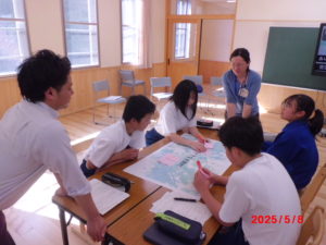 5月8日(木)にふるさとタイムの1回目が行われました。ふるさとタイムとは、生徒一人一人が村に関わる課題を1つ決め、1年間その課題解決のために取り組む総合的な学習の時間です。第1回目は、役場の地域振興課の方2名、地域おこし協力隊の方2名を講師にお招きし、地域の課題や地域の魅力について話をしていただき、生徒達の課題決定の参考としました。
