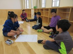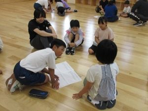 小学生と中学生とで縦割りグループを作り、小中で語る会を行いました。今回は、1学期のお願いについて、中間評価を中学生の司会で行いました。「あいさつ」「仲良く」「チャレンジ」について。よくできたこと、もっとがんばれたこと、これからがんばりたいことの3点で考えを発表しあいました。中学生が、「そうだね」「おなじだなあ」など声をかけながら司会を進めてくれました。とてもよい雰囲気で伝え合いができました。