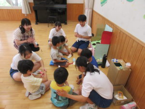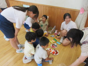 2年生は、家庭科として保育園実習をお行いました。園児が喜んでくれそうなおもちゃを手作りし、保育園に行って、園児と交流をしてきました。園児は、大きなお兄さん、お姉さんに大喜びでした。手作りおもちゃも大好評でした。子供の目線になって話しかけている中学生の姿はとてもいいなあと思いました。