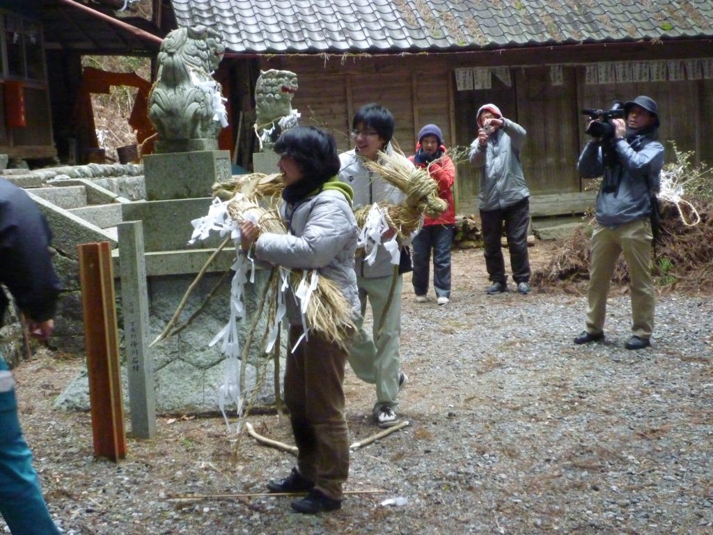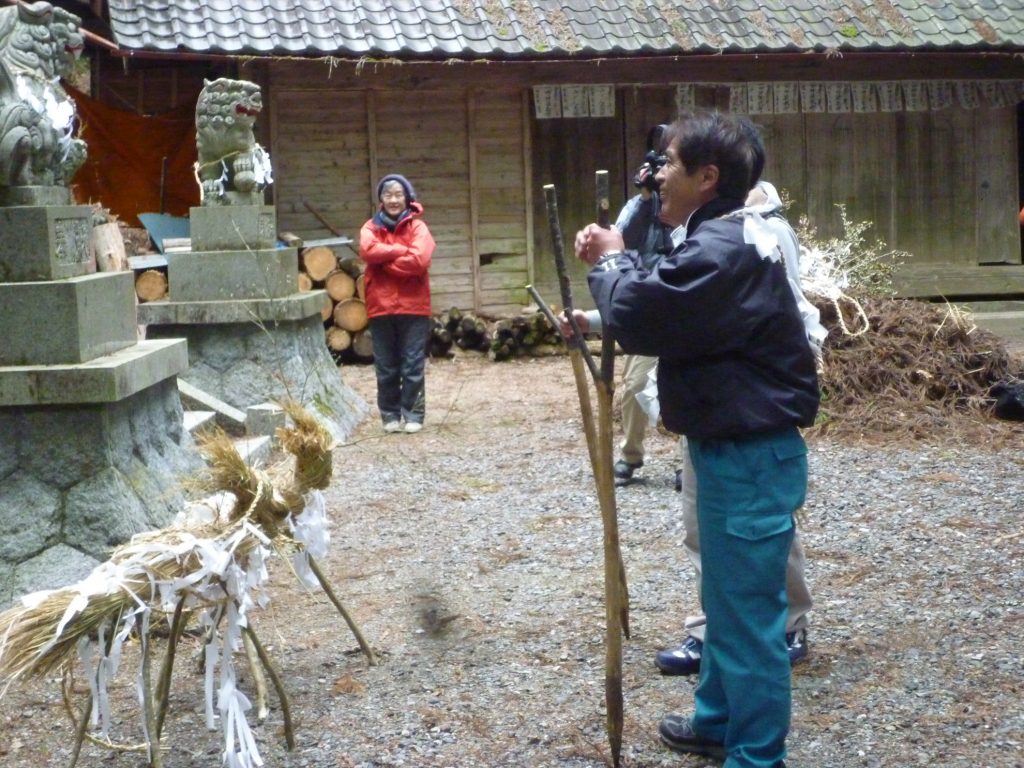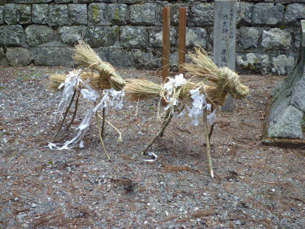これは鳥獣の被害や天災を免れて豊作を祈願する祭りとされ、境内前庭に藁(わら)で作った雌雄の鹿が2頭並べられます。胴は藁、足や角は楓、舌は杉板で作り、お腹には小豆飯を入れて注連縄で飾り付けます。