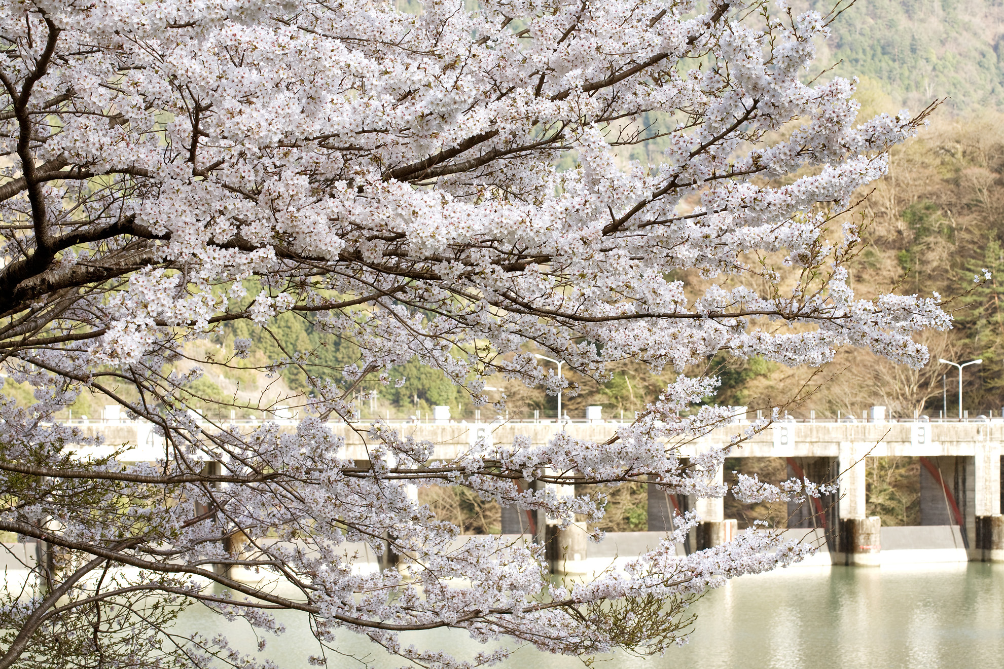平岡ダムに桜が映えます。ウオーキングコースもあります。