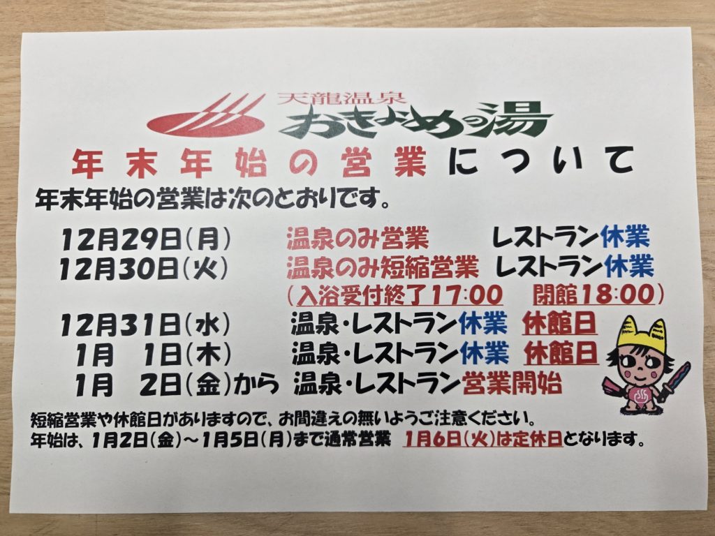今回は、おきよめの湯の年末年始の営業についてご案内いたします。